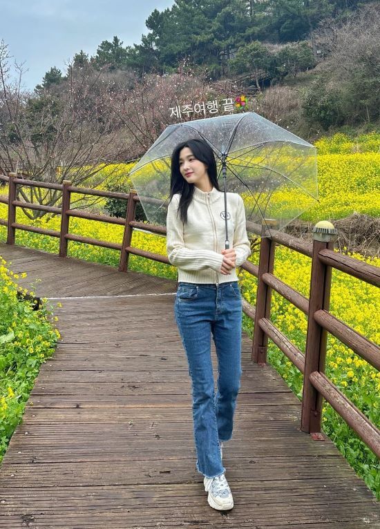 공개된 사진 속 율희는 제주도를 찾아 유채꽃 가득한 관광지에서 포즈를 취하고 있다.