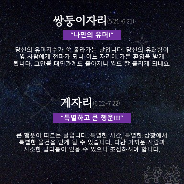 싱글인 분이라면 새로운 이성을 만날 수 있게 됩니다. 다만 물고기자리와 황소자리의 사람은 피하는 것이 좋겠네요. 커플인 경우 오전에 만나면 둘 사이가 더욱 좋아지게 될 것입니다.