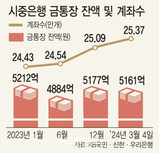 반면 금 통장 계좌 수는 꾸준히 늘어나고 있다. 3개 은행의 금 통장 계좌 수는 작년 1월 24만 4259개에서 꾸준히 오름세를 보이다가 같은 해 12월 25만개를 넘어섰고, 지난 4일 기준 25만 3703개까지 늘어났다. 신규 고객 수는 꾸준히 늘어나면서 금 통장을 보유한 고객들 일부는 매도를 통해 차익 실현에 나선 것으로 보인다