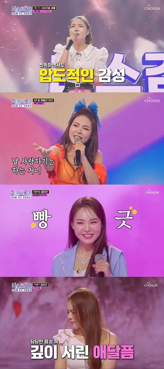 예선전부터 직접 따 모은 꿀을 들고 오는 당찬 모습을 보여준 미스김은 1대 미스트롯 진 송가인을 연상케 하는 깊은 정통트로트로 시청자들은 물론, 마스터들의 마음까지 단번에 사로잡으며 이목을 집중시켰다.