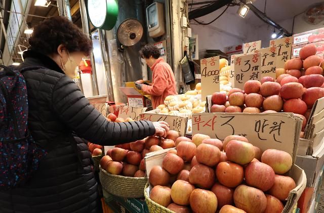 位于首尔清凉里的蔬果市场内,市民们正在选购水果。【图片提供 韩联社】