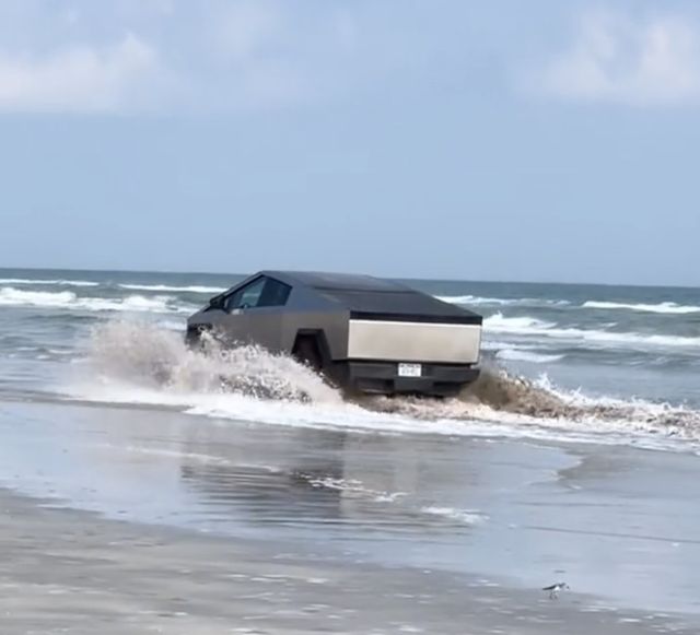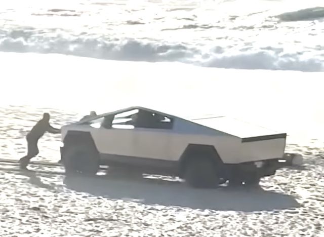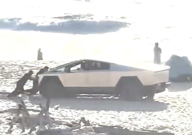 테슬라 사이버트럭이 해변의 모래사장에 갇힌 영상이 공개되며 험지 주행능력을 의심받고 있다.