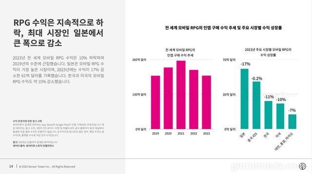 장르적으로는 모바일 하이브리드 캐주얼게임 수익은 증가했으나 RPG를 포함한 미드코어 장르는 감소세를 보였다. 특히 2023년 글로벌 모바일 RPG 수익은 10% 하락해 2019년 수준에 근접했다. 모바일 RPG 수익이 가장 높은 일본은 2023년에는 수익이 17% 감소한 61억 달러에 그쳤고, 한국과 미국 모바일 RPG 수익도 약 10% 감소했다.