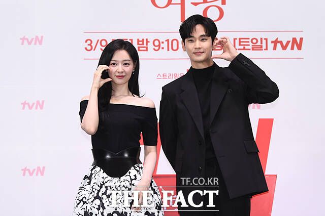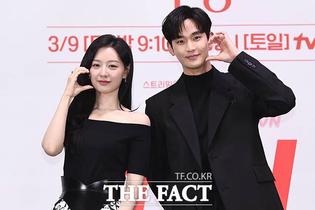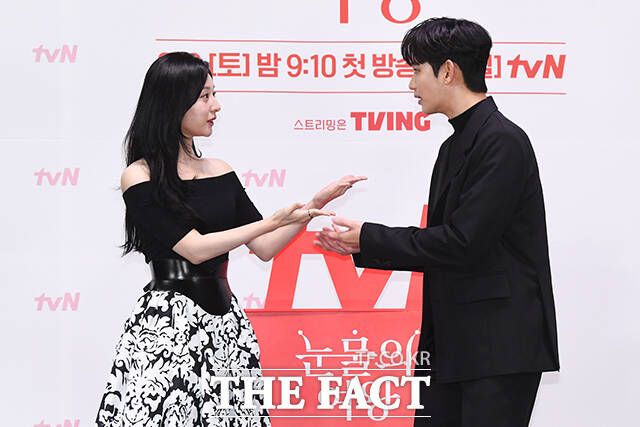 [더팩트ㅣ서예원 기자] 배우 김지원(왼쪽)과 김수현이 7일 오전 서울 구로구 라마다서울신도림호텔에서 열린 tvN 새 토일드라마 '눈물의 여왕' 제작발표회에 참석해 포즈를 취하고 있다.