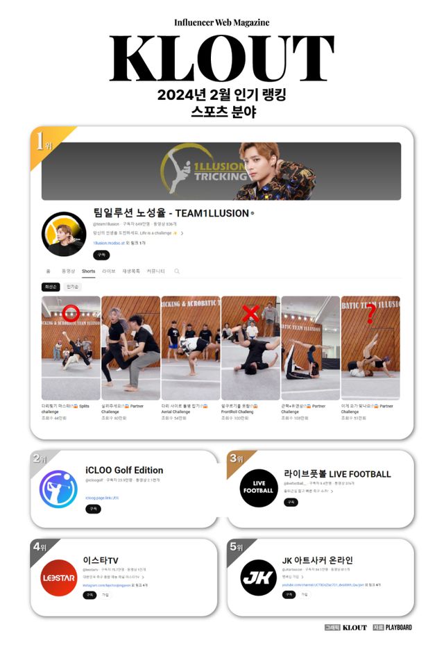 ‘다리만 찢었는데 500만뷰’ 팀일루션 노성율, 스포츠 유튜버 조회수 1위 [클라우트 랭킹]