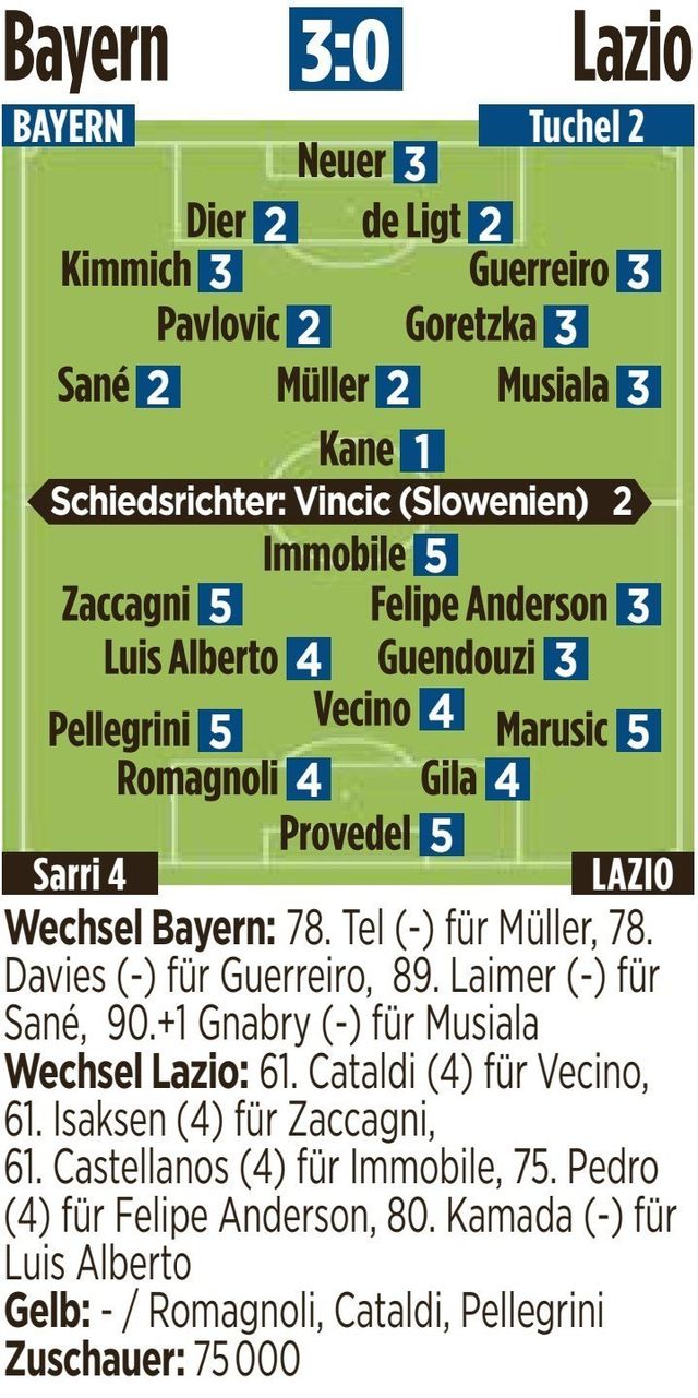 마누엘 노이어가 골문을 지키는 가운데 백4는 왼쪽부터 하파엘 게헤이루 에릭 다이어, 마테이스 더 리흐트, 유수아 키미히가 차지할 것으로 나왔다. 더블 볼란테는 알렉산다르 파블로비치, 레온 고레츠카다. 2선은 자말 무시알라, 토마스 뮐러, 리로이 사네, 원톱은 해리 케인이 선발 출격할 것으로 분석된다.