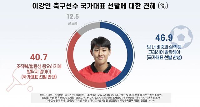 이강인 국가대표 선발에 대한 여론조사 결과 '팀 내 비중과 실력 등을 고려해 발탁해야 한다(찬성)'는 답변이 46.9%로 나타났다. '조직력·협동심이 중요한 만큼 발탁하지 말아야 한다(반대)'는 40.7%를 기록했다. 12.5%는 '잘 모른다'고 답했다.