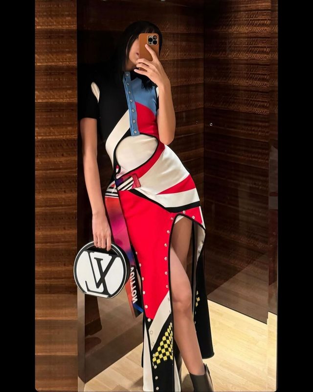 화이트와 블랙 색상의 조화가 돋보이는 ‘어라운드 미 PM’을 비비드한 컬러감의 슬림 니트 원피스와 매치한 리사. 원형 실루엣에 매끈한 곡선을 이루는 일체형 핸들, LV 이니셜이 가운데 큼지막하게 들어간 게 특징이다. 하우스의 LV 서클 시그너처에서 영감받았다고. 가방 뒷면엔 플랫 포켓이 있으며, 탈착 가능한 스트랩을 사용하면 크로스백으로도 연출 가능하다. 콤팩트한 사이즈로 어느 룩에나 포인트 주기 제격일 듯!