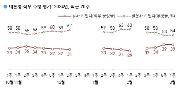 한국갤럽이 3월 5~7일 전국 만 18세 이상 유권자 1000명에게 ‘윤 대통령이 현재 대통령으로서의 직무를 잘 수행하고 있다고 보는지 잘못 수행하고 있다고 보는지’ 물은 결과, 39%가 긍정 평가했고 54%는 부정 평가했다.