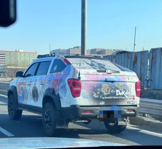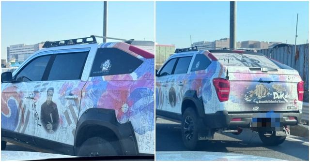 사진에는 태극기와 우리나라를 상징하는 무궁화, 독도, 훈민정음 그리고 안중근 의사와 이순신 장군 등 나라를 빛낸 위인들의 그림이 빼곡히 랩핑 된 차량의 모습이 담겨 있다.