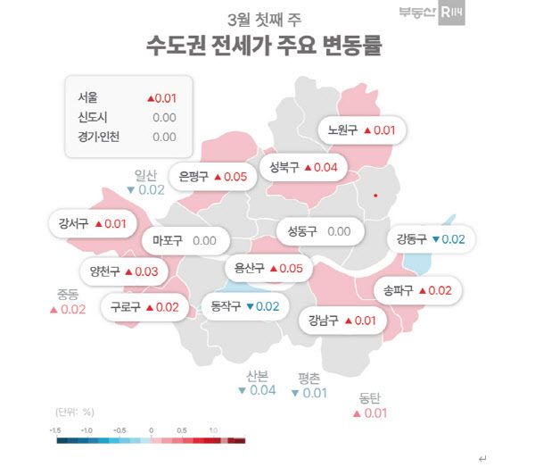 전세시장은 봄 이사철 영향은 물론 매매 시장으로 이동하지 못한 수요층이 가세하면서 시세 대비 저렴한 임대차 물건들은 대부분 소진된 분위기다. 서울이 0.01% 상승했고, 신도시와 경기·인천은 보합(0.00%)을 나타냈다.