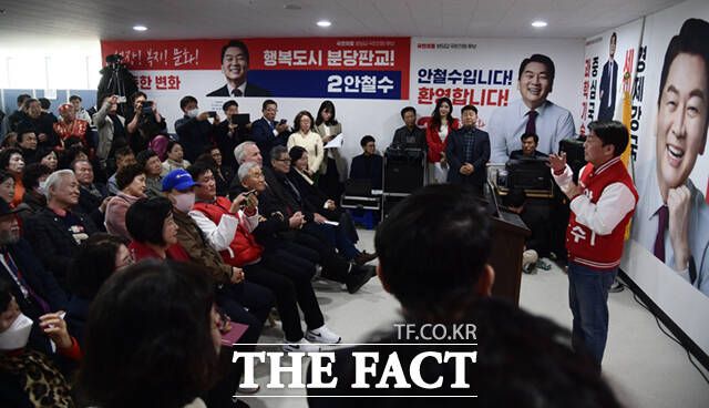 안철수 국민의힘 경기 성남 분당갑 후보가 8일 오후 경기 성남시 분당구 선거사무실에서 열린 개소식에서 '재건축' 등 공약을 발표하고 있다.
