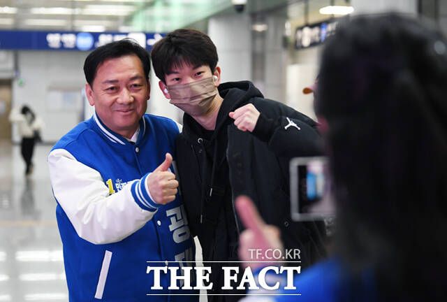 이광재 더불어민주당 경기 성남 분당갑 후보가 8일 오전 경기 성남 분당구 판교역에서 출근하는 시민들에게 인사하며 파이팅을 외치고 있다.