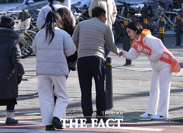 잠룡 매치 사이에 출사표를 던진 류호정 개혁신당 후보 역시 야탑역 앞에서 주민들을 만났다. 개혁신당의 오렌지색 띠를 두른 채 등장한 류 후보는 주민들에게 인사하며 고개를 숙였다. 류 후보를 알아본 일부 어르신들은 다가와 악수를 건네기도 했다.