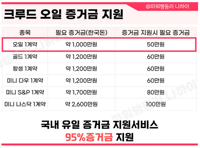 증거금 지원을 받을시 크루드 오일1계약 50만원으로 진행을 할 수 있습니다.