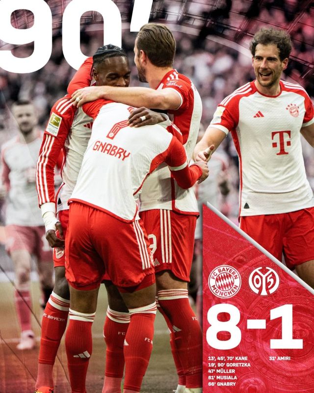 해리 케인이 해트트릭에 성공했고, 레온 고레츠카(2골) 토마스 뮐러·자말 무시알라·세르쥬 그나브리(이상 1골)가 골맛을 봤다. 마인츠는 나디엠 아미리가 프리킥으로 1골 만회하는 데 그쳤다.