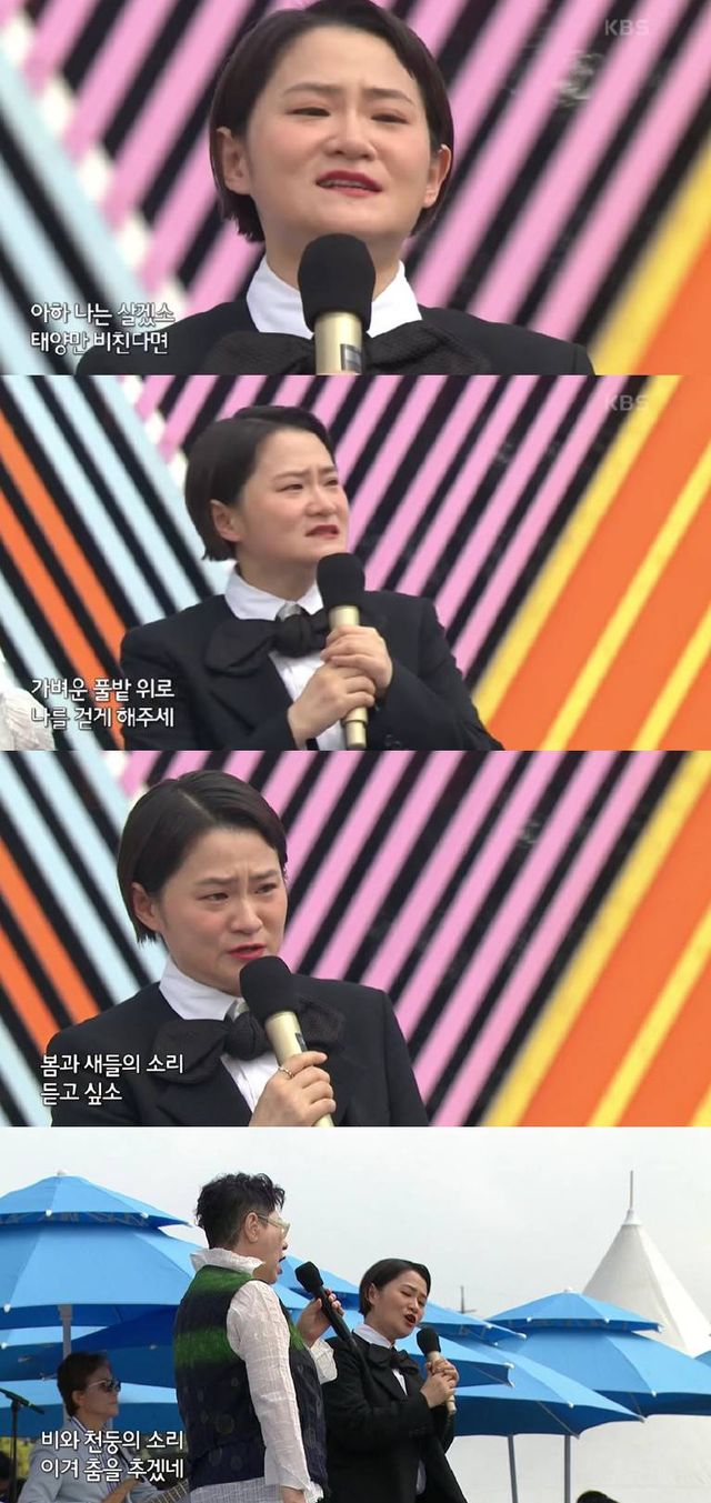 눈가에는 촉촉히 눈물이 보였고, 김신영은 "제가 찔찔보가 아닌데 어렸을 때 힘들었을 때 불렀던 노래를 '전국노래자랑' 첫 방송에 함께 부르게 돼서 벅차 울게 됐다"고 밝혔다.