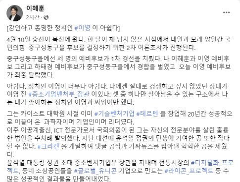 이 전 의원은 이날 새벽 자신의 SNS에 3자 경선에서 탈락한 이영 전 장관을 ‘훌륭한 정치인’이라 추켜세우는 글도 올렸다.
