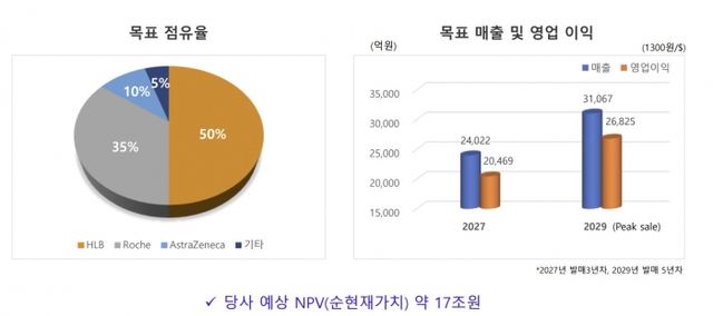 목표 매출 및 영업이익은 허가를 받은지 3년이 지난 시점에 모두 2조원을 넘길 것으로 보고 있으며, 오는 2029년에는 3조원 이상의 매출과 2조7000억원의 영업이익을 달성할 것으로 예측하고 있다.