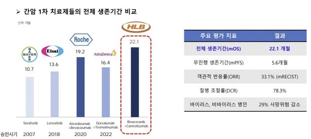 리보세라닙 병용요법 글로벌 임상3상은 지난 2019년부터 2022년까지 13개국 121개 병원에서 543명 시험대상자(리보세라닙+캄렐리주맙 272명, 대조군 소라페닙 271명)를 상대로 진행했으며, 그 결과 전체 생존기간(mOS)이 22.1개월로 간암 1차 치료제들 중 최장 환자 생존기간을 기록했다.