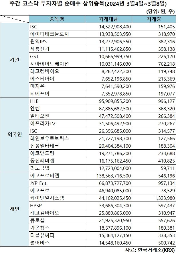 기관 'ISC'·외인 'HLB'·개인 '에코프로비엠' 1위 [주간 코스닥 순매수- 3월4일~3월8일]