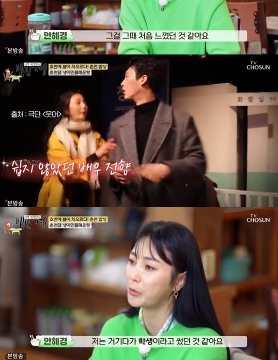 안혜경은 "첫 시작이 그렇게 순탄하지 않았다. 기상캐스터의 정점에서 그만뒀다. 정점에서 그만두면 정점에서 올라갈 줄 알았는데 그게 그렇게 안 되더라. 배우의 길은 바닥부터 시작하더라. 처음 느꼈다. 부족한 점을 너무 많이 알아서 그걸 채우기 위해 연극을 시작했고 꾸준히 하고 있다"라고 말했다.