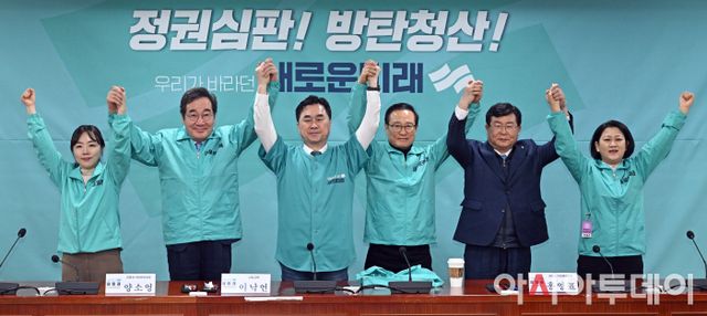 이낙연 새로운미래 공동대표와 김종민 상임선대위원장, 홍영표 공동선대위원장 등 참석자들이 11일 국회 의원회관에서 열린 선거대책위원회 출범식에서 기념촬영을 하고 있다. 왼쪽부터 양소영 공동선대위원장, 이낙연 공동대표, 김종민 상임선대위원장, 홍영표 공동선대위원장, 설훈 의원, 김영선 공동선대위원장. /송의주 기자