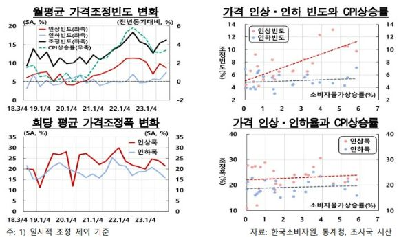 한은은 "고물가 시기에 기업들이 가격 변화에 따른 소비자의 저항 및 민감도, 경쟁 제품의 대체 효과 등을 고려해 가격 인상 시 '인상 폭'보다는 '빈도'를 조정한다"며 "이에 물가상승률과 가격 인상 빈도 간 상관성이 높게 나타난 것으로 추정한다"고 분석했다.