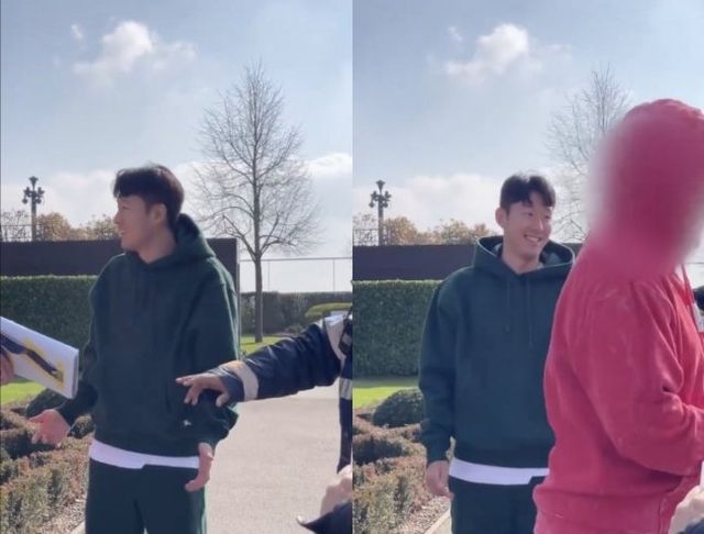 영상에 따르면 손흥민은 붉은 후드티를 입은 남성이 다가와 사인을 요구하자 이를 거절했다.
