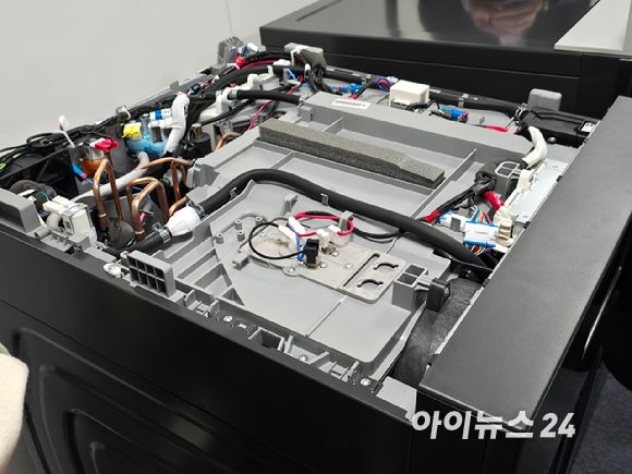일체형 세탁·건조기는 설계 공간이 기존 대비 절반 수준으로 줄어들 수밖에 없다. 삼성전자는 하드웨어 혁신을 위해 기존 건조기 아래쪽에 있던 히트펌프(컴프레서+열교환기)를 상단에 최적화한 형태로 설계해 배치했다. 기존 상단에 있던 세제 자동투입 장치는 하단으로 재배치하는 등 설계부터 부품 배치까지 핵심 기술을 적용했다.