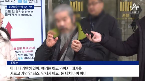 약 3분간 발언을 이어가던 조두순은 주위에서 자신을 제지하자 "가만히 있어. 얘기하고 가야지. 얘기를 자르고 가면 안 되지"라며 "만지지 마요. 돈 터치 마이 보디"라고 말하며 막무가내 발언을 이어가려 했다.