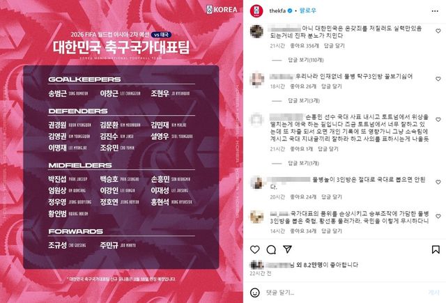축구 국가대표팀 선발 명단에 네티즌 반응 / 대한민국 축구 국가대표팀 공식 인스타그램 댓글창