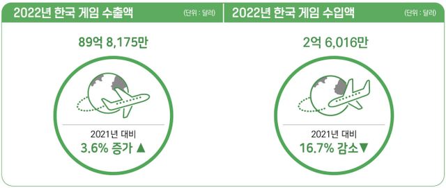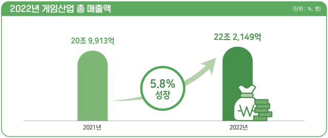 2022년 국내 게임산업 매출액은 전년 대비 5.8% 증가한 22조2149억원으로 집계됐고, 수출액도 89억8175만 달러(약 11조 6039억원)로 전년 대비 3.6% 증가한 것으로 나타났다.