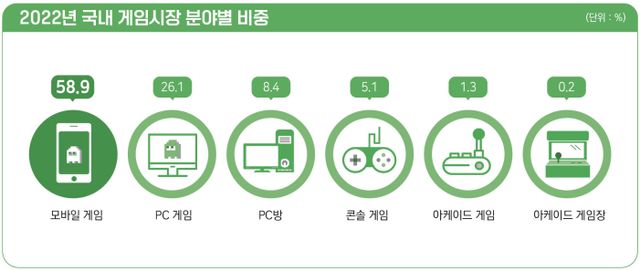 2022년 모바일 게임 매출액은 13조720억원으로 전체 게임산업 매출액의 58.9%를 차지했다. 이어 PC게임 매출액은 5조8053억원(점유율 26.1%), 콘솔게임 매출액은 1조1196억원(5.1%), 아케이드 게임 매출액은 2976억원(1.3%)을 기록했다.