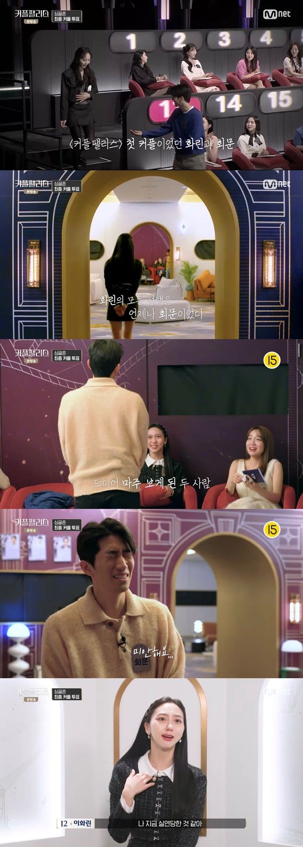 이날 방송에서는 12번 이화린이 최종 커플 투표에서 32번 김회문에 한 표도 받지 못하고 커플팰리스를 떠나는 중간 퇴소자가 됐다. 커플팰리스 첫 커플이었던 둘은 매번 같은 곳을 바라보다 이화린의 말 한마디로 인한 오해 때문에 엇갈리게 됐다.
