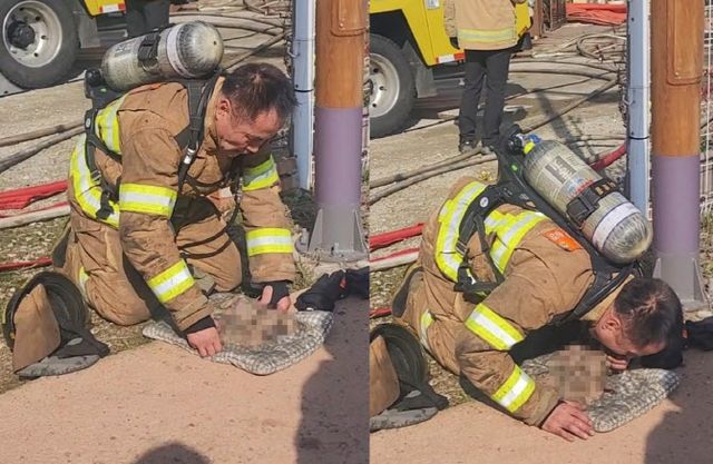 이 소방위는 강아지들을 안전한 곳으로 이동시킨 뒤 푹신한 방석 위에 눕혔다. 그리고는 무릎을 꿇은 채 앉아 곧바로 심폐소생술을 시작했다. 가슴압박에도 눈을 뜨지 않자 주저없이 인공호흡까지 시도했다. 행여나 작은 몸에 무리가 갈까 방화 장갑마저 벗어 던졌다. 그렇게 생명을 살리기 위한 사투는 15분여간 계속됐다.