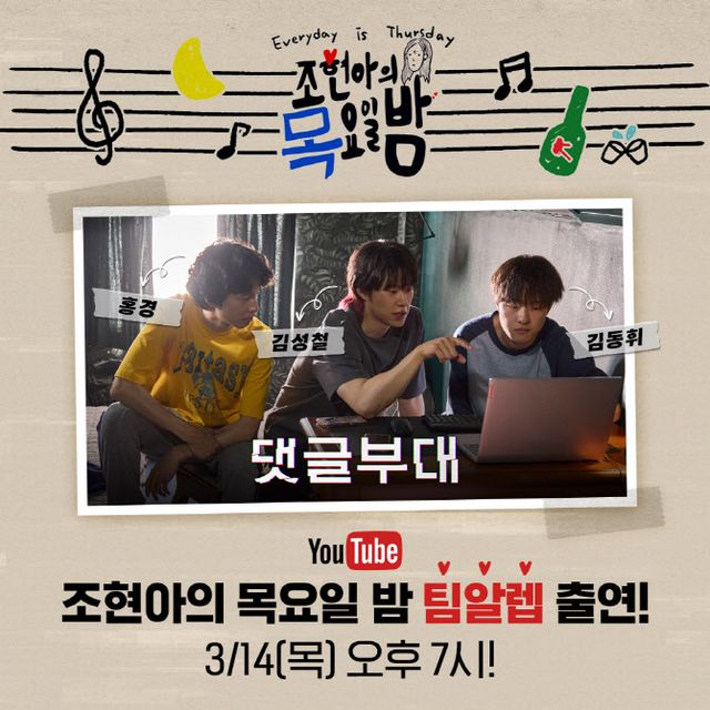 ‘댓글부대’는 대기업에 대한 기사를 쓴 후 정직당한 기자 임상진(손석구 분)에게 온라인 여론을 조작했다는 익명의 제보자가 나타나면서 벌어지는 이야기 를 담았다. ‘댓글부대’의 김성철, 김동휘, 홍경이 내일(14일) 저녁 7시 유튜브 ‘조현아의 목요일 밤’에 출연해 ‘팀알렙’의 특별한 케미스트리를 예고한다. ‘조현아의 목요일 밤’은 조현아가 진행하는 뮤직 토크쇼로 게스트와 함께 수다를 떨며, 음악에 대한 이야기를 나누는 콘셉트로 진행된다. 이번에는 ‘나 댓글부대 ‘팀알렙’ 사랑했네?’를 주제로 영화 ‘댓글부대’에 대한 다채로운 이야기를 나눈 것으로 전해져 기대를 모은다. 이날 방송에서는 주연 배우들이 독특한 방식으로 설명하는 작품 소개와 캐릭터 소개를 들려줄 예정이다. 또한 ‘팀알렙’ 멤버 ‘찡뻤킹’, ‘찻탓캇’, ‘팹택’ 등 독특한 캐릭터 명이 탄생한 비하인드가 공개될 예정으로 그 배경에 관심이 쏠린다. 마지막으로 ‘댓글부대’ 배우들은 ‘사적이고 사소한 고민 상담’을 통해 현재 가지고 있는 소소한 고민을 털어놓아 그 어디에서도 들을 수 없었던 이야기로 기대감을 높인다.