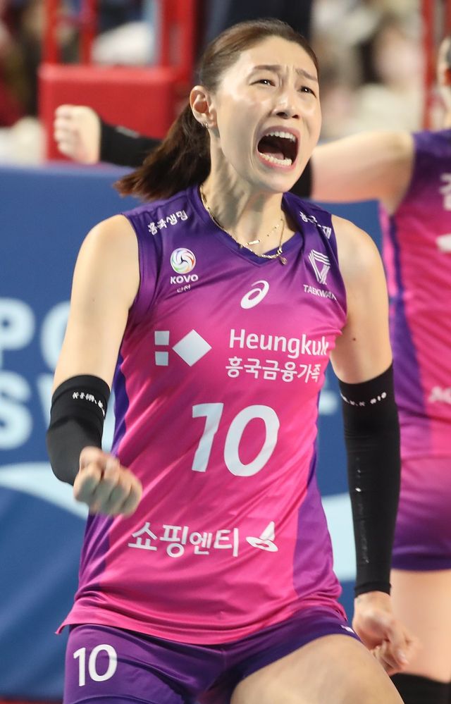 지난해 4월 4일 오후 경북 김천실내체육관에서 열린 여자 프로배구 '2022-2023 V리그 챔피언결정전' 한국도로공사 하이패스 배구단과 흥국생명 핑크스파이더스의 4차전 경기에서 흥국생명 김연경이 득점 성공에 환호하고 있다. / 뉴스1