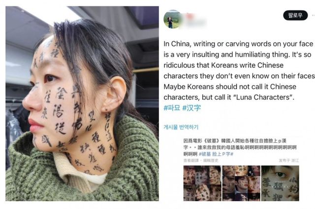 중국의 한 누리꾼이 자신의 엑스(옛 트위터)에 배우들이 화를 피하기 위해 얼굴이나 몸에 한자를 새긴 것에 대한 조롱 글을 올렸는데, 약 600만 조회수를 기록하며 논란이 되고 있습니다.