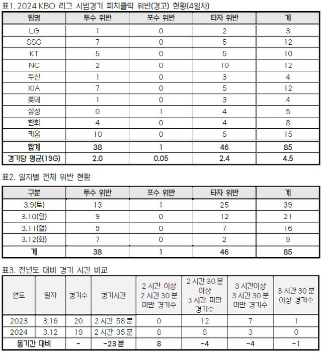 KBO는 “시범경기 첫날 39건, 2일차 21건, 3일차 16건, 4일차 9건(4경기)의 위반이 발생, 경기가 진행될수록 위반 사례가 감소하는 등 선수단이 규정에 적응하기 위해 노력하고 있다”고 설명했다.