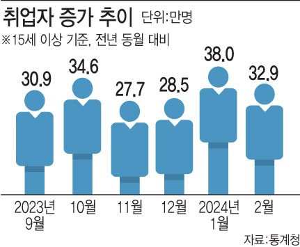 13일 통계청이 발표한 ‘2024년 2월 고용동향’에 따르면 지난달 15세 이상 취업자 수는 2804만 3000명으로 1년 전보다 32만 9000명 증가했다. 취업자 수는 지난해 10월 34만 6000명에서 11월(27만 7000명)과 12월(28만 5000명) 20만명대에 머물렀지만, 새해 들어 다시 2개월째 30만명대를 유지하고 있다. 다만 1월(38만명)에 비해 증가 폭은 둔화했다.