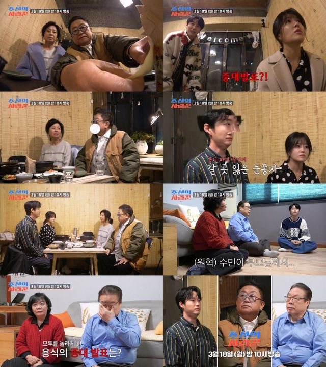 제작진과 이야기를 나눈 뒤 잔뜩 굳은 표정으로 이수민♥원혁과의 저녁 자리에 나간 이용식은 ‘손주, 파주, 건강’이라고 적힌 메모를 식사 직전까지 들여다봤다. 그리고 마침내 ‘중대발표’의 실체를 접한 원혁은 침만 꿀꺽 삼킬 뿐 제대로 말을 잇지 못했다. 원혁의 부모님 또한 이 소식에 심각한 표정을 숨기지 못한 가운데, 이용식의 ‘중대발표’ 내용은 본 방송에서 공개된다.