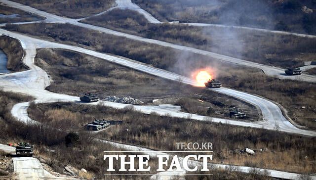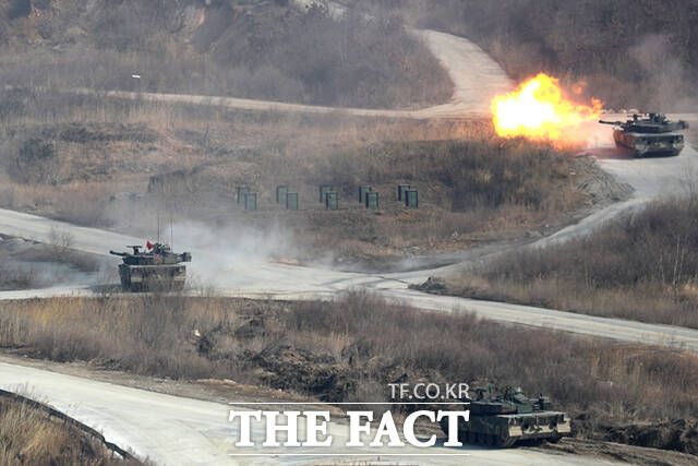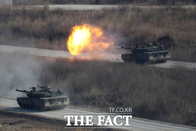 한미연합 통합화력훈련이 열린 14일 오전 경기도 포천 승진훈련장에서 육군 수도기계화보병사단의 K1A2전차가 사격하고 있다. /사진공동취재단