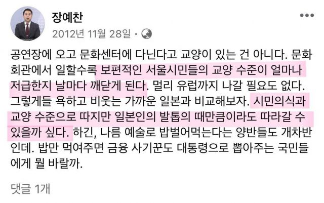 국민의힘에서 당내 경선을 거쳐 부산 수영구에 22대 총선 공천을 받은 장예찬 전 최고위원이 과거 '서울시민의 교양수준이 일본인만 못하다'고 주장하는 글을 쓴 것으로 확인됐다.