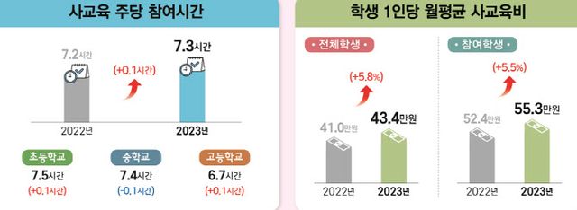 학령인구 감소 추세에 따라 초중고 학생 수는 전년(2022년) 528만명에서 2023년 521만명으로 7만명 감소했다. 학생 수가 감소한 상황에서 사교육비 지출 총액은 늘어난 것이다. 당연한 결과로 학생 1인당 월평균 사교육비도 43만4000원을 기록, 통계 작성 이래 사상 최고액을 찍었다.