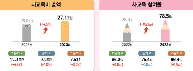 지난해 기준 우리나라 사교육비 총액은 27조1000억원을 기록했다. 전년도(2022년) 26조원에서 1년 새 4.5%(1조2000억원)가 증가한 수치다. 정부가 사교육 관련 통계를 내기 시작한 2007년 이후 가장 큰 규모다. 국내 사교육비 총액은 2019년 21조원에서 2020년 19조4000억원으로 잠시 주춤했지만 이후 반등해 △2021년 23조4000억원 △2022년 26조원 △2023년 27조1000억원으로 3년 연속 상승했다.