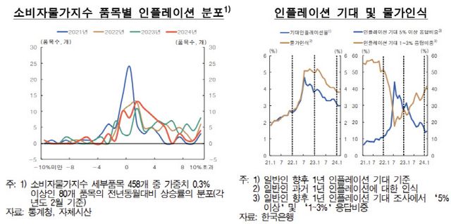 한은은 인플레이션 국면을 세 가지 측면에서 진단했다. 첫 번째는 물가의 부문간 파급이다. 한은은 “일부 품목의 가격 상승이 여타 품목으로 파급되는 정도가 줄어들고 있으나 아직 일부 품목의 가격 조정이 전체 인플레이션 분포에 영향을 미치고 있는 모습”이라고 밝혔다. 다만 내수가 부진하기 때문에 근원물가 상승률이 낮아지는 등 기업들이 원가 부담을 소비자 가격에 반영하는 추세는 약해졌다는 평가가 나온다.