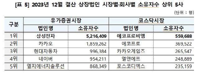 코스닥 시장에선 에코프로 그룹 관련 종목들의 소유자가 큰 폭으로 늘어났다. 에코프로비엠(247540) 소유자 수는 55만9688명으로 코스닥 시장 내 가장 많은 소유자 수를 기록했고, 에코프로(086520)(36만9522명)와 카카오게임즈(293490)(26만5547명)이 그 뒤를 이었다.