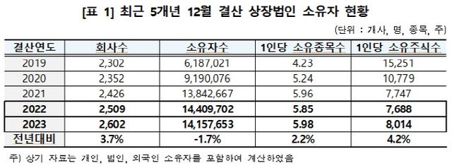 이들이 소유한 주식 수는 약 1135억주로 집계됐다. 소유자 1인당 평균 소유 주식 수는 8014주로 전년 대비 4.2% 증가했고, 1인당 평균 소유 종목 수도 5.98 종목으로 전년 대비 2.2% 늘어났다.