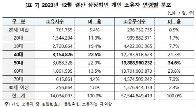 아울러 개인 소유자를 나이별로 보면 40대가 315만명(22.5%)으로 가장 큰 비중을 차지했다. 이어 50대(22%), 30대(19.4%), 60대(13.5%), 20대(11.0%) 순으로 나타났다. 다만, 소유주식 수 비중으론 50대가 199억주(34.6%)로 가장 큰 비중을 차지했고 이어 60대(23.8%), 40대(21.3%), 70대(7.9%), 30대(7.7%) 순이었다.